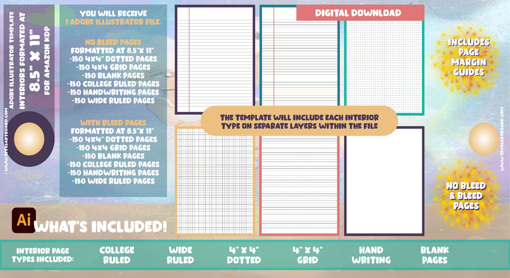 -One 8.5"x 11" KDP Formatted Template for Adobe Illustrator. The template includes a variety of page interiors including: 4”x4” dotted pages, 4”x4” grid pages, blank pages, college ruled pages, handwriting pages and wide ruled pages!